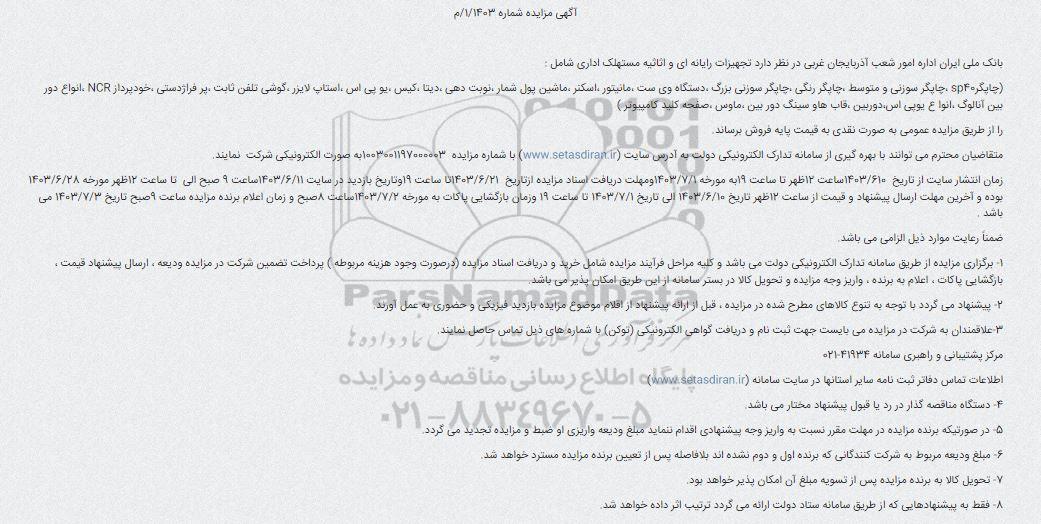 بانک ملی ایران اداره امور شعب آذربایجان غربی در نظر دارد تجهیزات رایانه ای و اثاثیه مستهلک اداری شامل :
