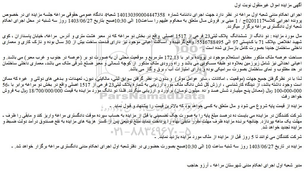 مال مورد مزایده : دو دانگ از ششدانگ پلاک ثبتی23 فرعی از 1517 اصلی واقع در بخش دو مراغه که در معبر هشت متری و آدرس مراغه، خیابان پاسداران ، کوی شهید اخلاص ،پلاک 71 با کدپستی 97 الی 5516788495 واقع گردیده و اسکلت اعیانی موجود نیز دارای قدمت ساخت بیش از 30 سال بوده و نازک کاری و معماری داخلی ساختمان جدیدا بصورت کامل بازسازی شده است .