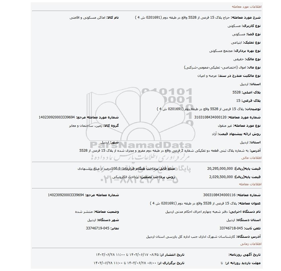 مزایده پلاک 15 فرعی از 5528 واقع در طبقه دوم (0201691 ش 4 ), مزایده، پلاک 15 فرعی از 5528 واقع در طبقه دوم (0201691 ش 4 )