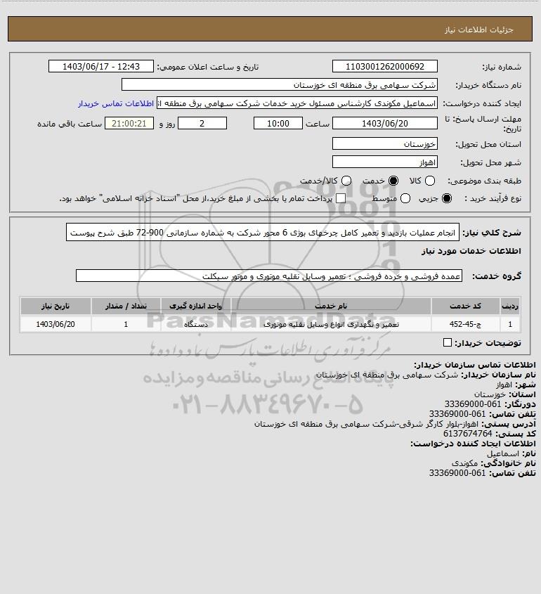 شرح کلی نیاز: انجام عملیات بازدید و تعمیر کامل چرخهای بوژی 6 محور شرکت به شماره