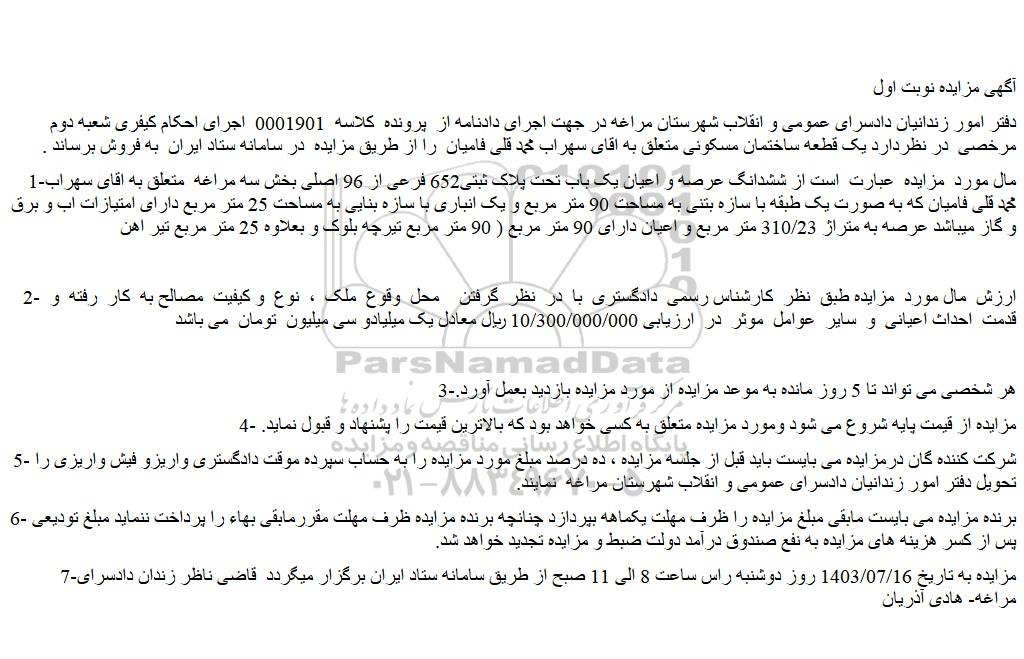 1-مال مورد  مزایده  عبارت  است از ششدانگ عرصه و اعیان یک باب تحت پلاک ثبتی652 فرعی از 96 اصلی بخش سه مراغه  متعلق به اقای سهراب محمد قلی فامیان که به صورت یک طبقه با سازه بتنی به مساحت 90 متر مربع و یک انباری با سازه بنایی به مساحت 25 متر مربع دارای امتیازات اب و برق و گاز میباشد عرصه به متراژ 310/23 متر مربع و اعیان دارای 90 متر مربع ( 90 متر مربع تیرچه بلوک و بعلاوه 25 متر مربع تیر اهن