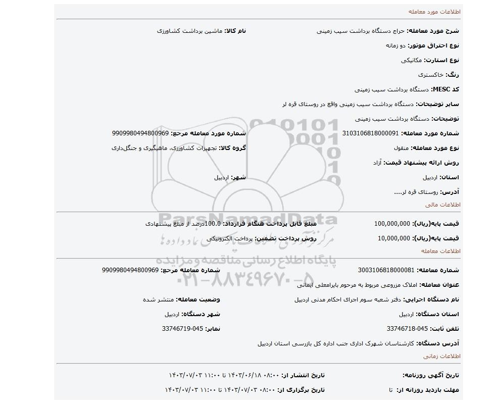 شماره مورد معامله: 3103106818000091شماره مورد معامله مرجع: 9909980494800969