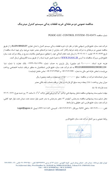 شرکت نفت ستاره خلیج فارس (سهامی عام) در نظر دارد خرید قطعات یدکی سیستم کنترل با نشان تجاری ALLEN BRADLEY را از طریق مناقصه عمومی دو مرحلهای به شرکت واجد شرایط واگذار کند، بنابراین از همه شرکتهای معتبر دعوت میشود برای تهیه اسناد مناقصه از تاریخ 1403.06.24 لغایت 1403.07.01 با ارسال نامه، اعلام آمادگی خود را (مطابق دستورالعمل مکاتبات مندرج در وبگاه شرکت نفت ستاره خلیج فارس سربرگ مناقصات به آدرس WWW.PGSOC.IR ) به همراه فیش خرید اسناد را از طریق پست الکترونیکی ارسال کنند.