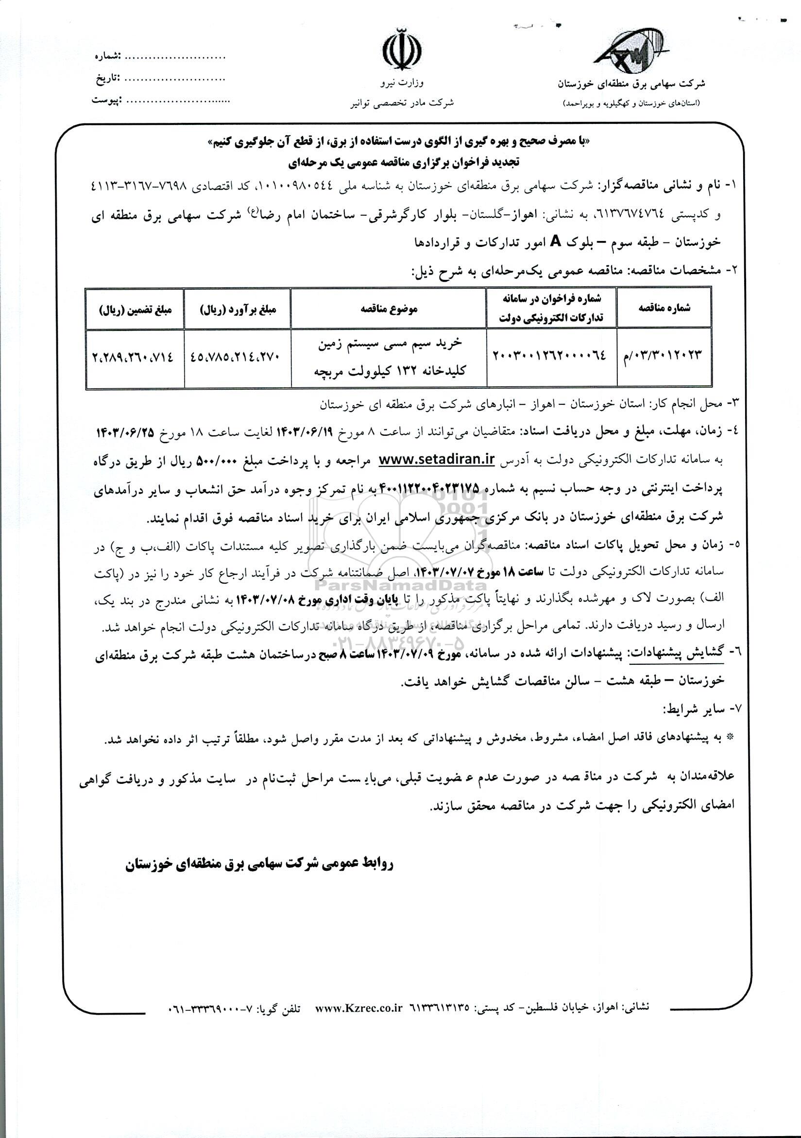 1- نام و نشانی مناقصه گزار : شرکت سهامی برق منطقه ای خوزستان به شناسه ملی 10100980544، کد اقتصادی 7698-3167-4113 و کد پستی 6137674764 به نشانی اهواز - گلستان - بلوار کارگر شرقی ساختمان امام رضا (ع) شرکت سهامی برق منطقه ای خوزستان - طبقه سوم - بلوک A امور تدارکات و قراردادها