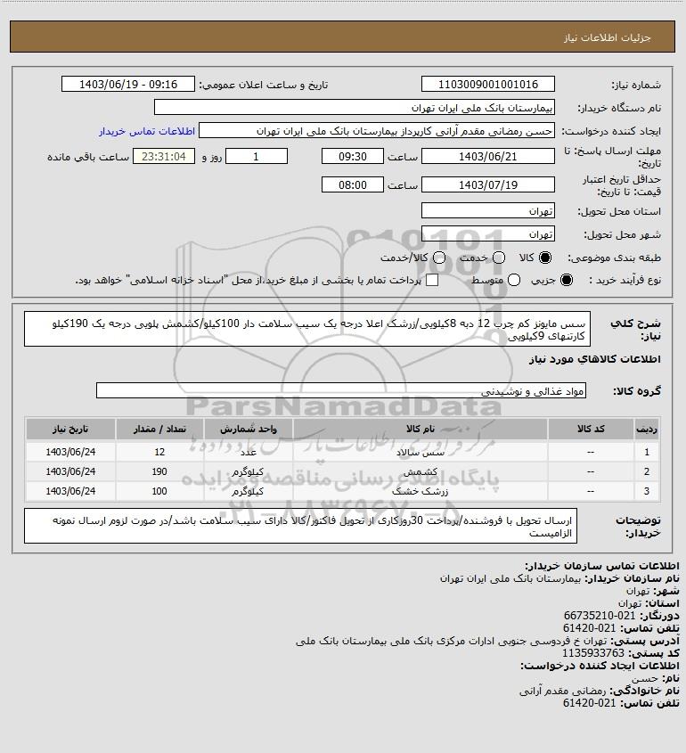 نام سازمان خریدار: بیمارستان بانک ملی ایران تهران