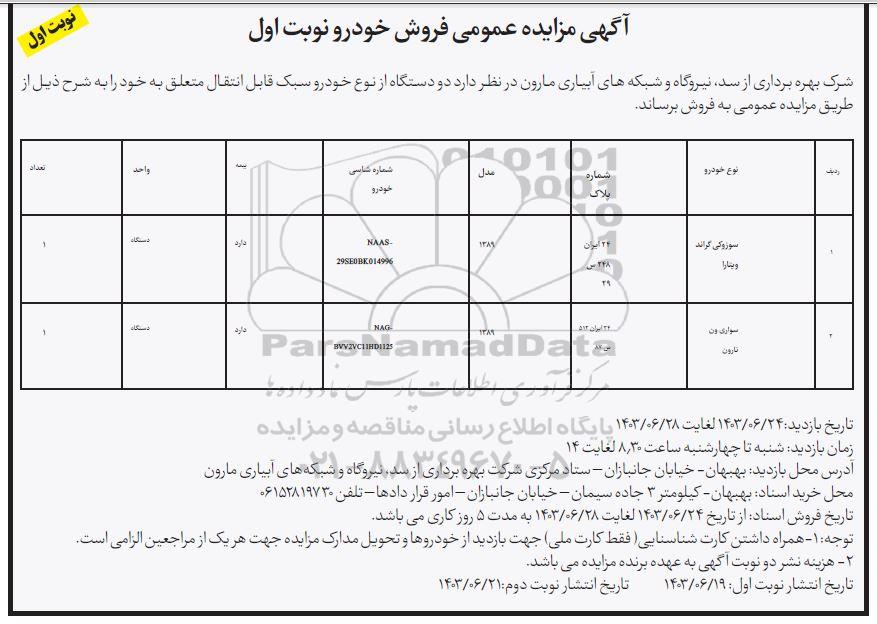 شرکت بهره برداری از سد، نیروگاه و شبکه های آبیاری مارون در نظر دارد دو دستگاه از نوع خودرو سبک قابل انتقال متعلق به خود را به شرح ذیل از طریق مزایده عمومی به فروش برساند.