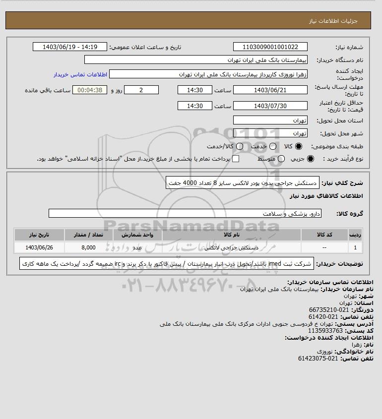 | 1 | -- | دستکش جراحی لاتکس | عدد | 8,000 | 1403/06/26 |