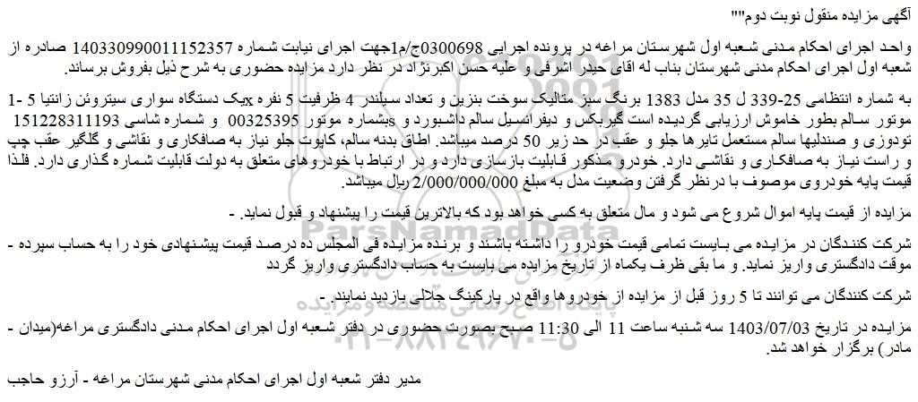 واحد اجرای احکام مدنی شعبه اول شهرستان مراغه در پرونده اجرایی 0300698ج/م1جهت اجرای نیابت شماره 140330990011152357 صادره از شعبه اول اجرای احکام مدنی شهرستان بناب له اقای حیدر اشرفی و علیه حسن اکبرنژاد در نظر دارد مزایده حضوری به شرح ذیل بفروش برساند.