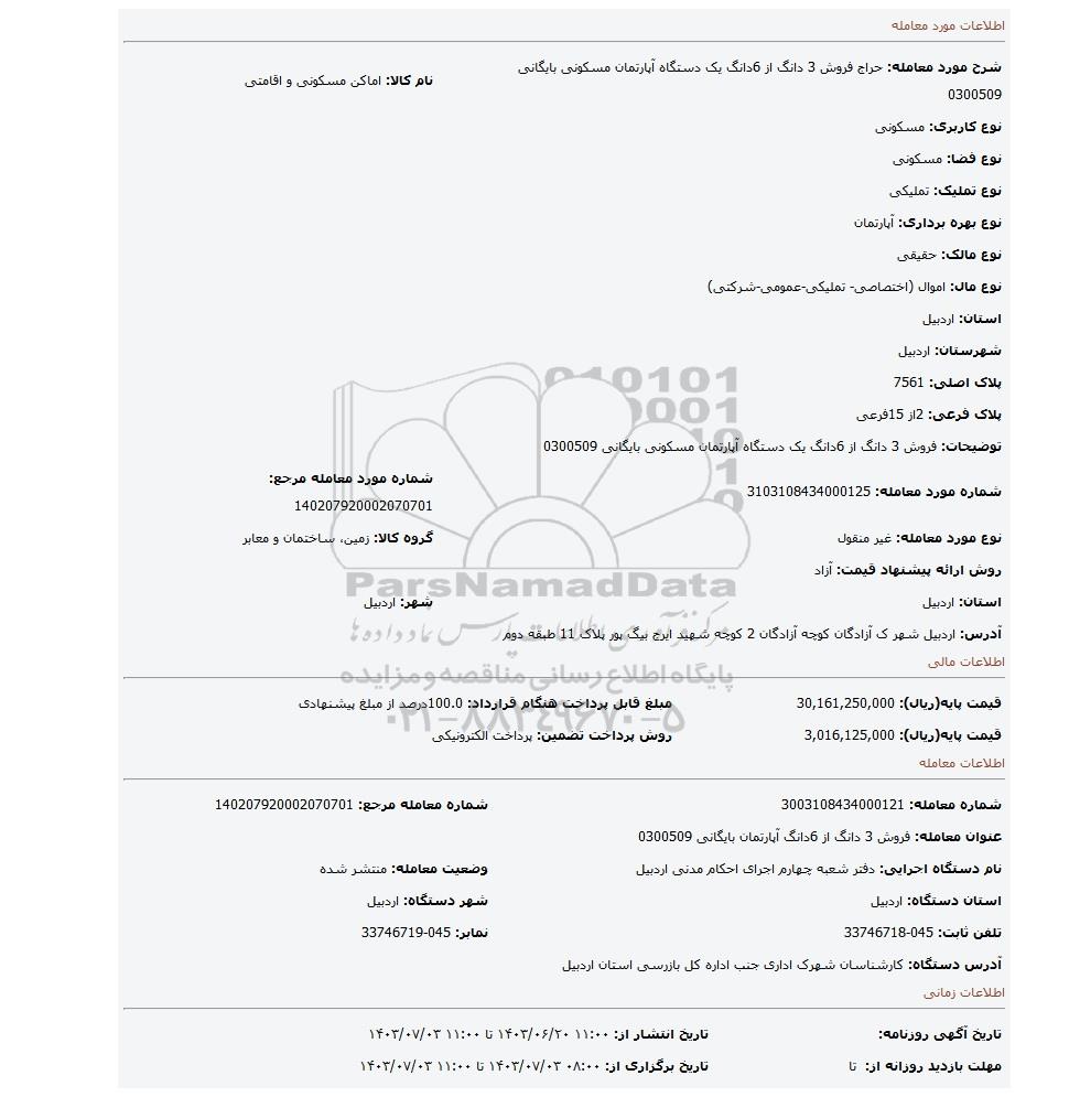 عنوان معامله: فروش 3 دانگ از 6دانگ آپارتمان بایگانی 0300509 | ||