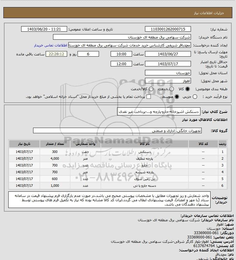شرح کلی نیاز: دستکش اشپزخانه-جارو-پارچه و...-پرداخت غیر نقدی