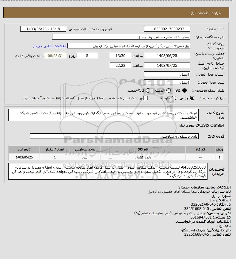 شرح کلی نیاز: ایروی باندکشی ساکشن تیوب و... طبق لیست پیوستی.عدم بارگذاری فرم پیوستی به منزله رد قیمت اعلامی شرکت خواهدشد.