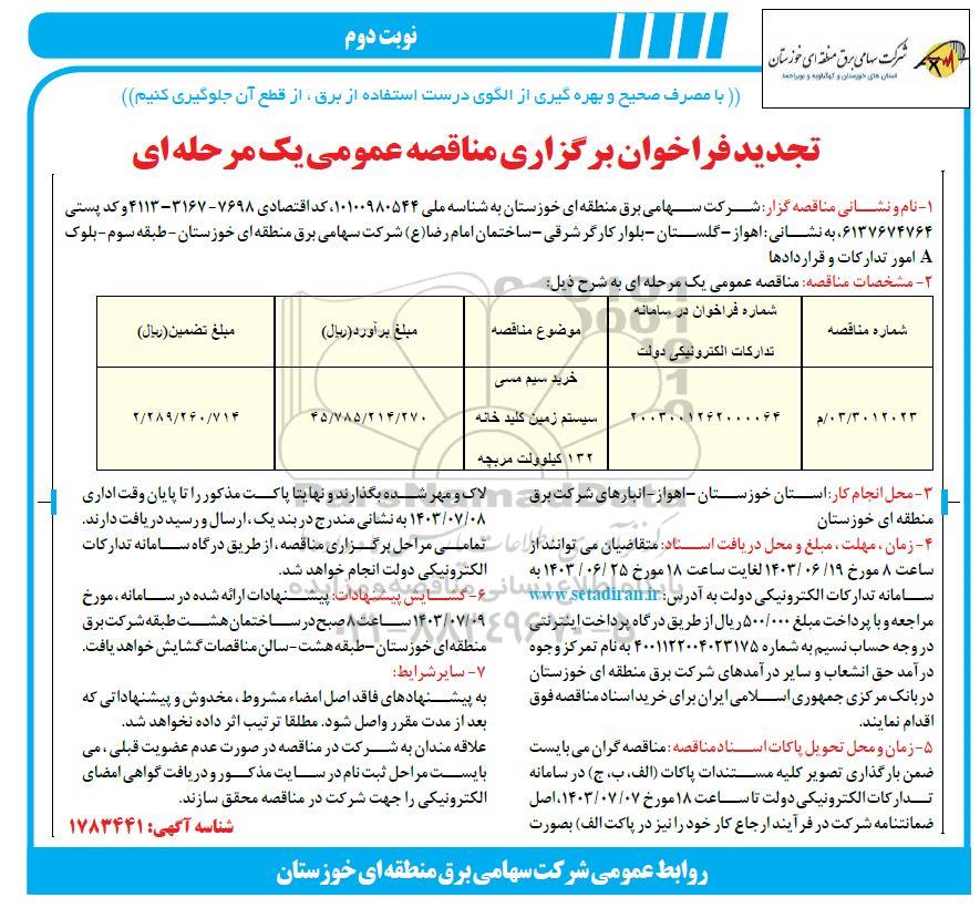 03/3012023/ م | 2003001262000064 | خرید سیم مسی سیستم زمین کلیدخانه 132 کیلوولت مربچه | 45.785.214.270 | 2.289.260.714 |