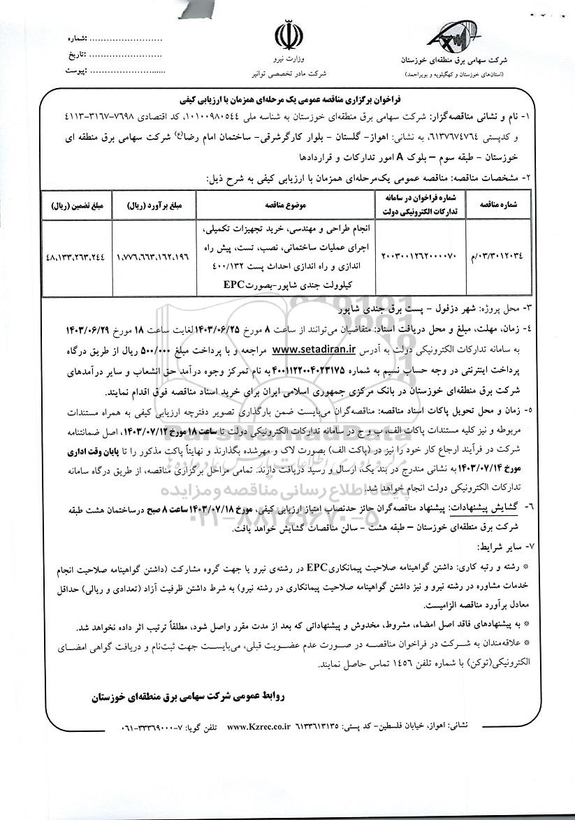 موضوع مناقصه: انجام طراحی و مهندسی خرید تجهیزات تکمیلی اجرای عملیات ساختمانی نصب تست پیش راه اندازی و راه اندازی احداث پست 400/132 کیلوولت جندی شاپور - بصورت EPC