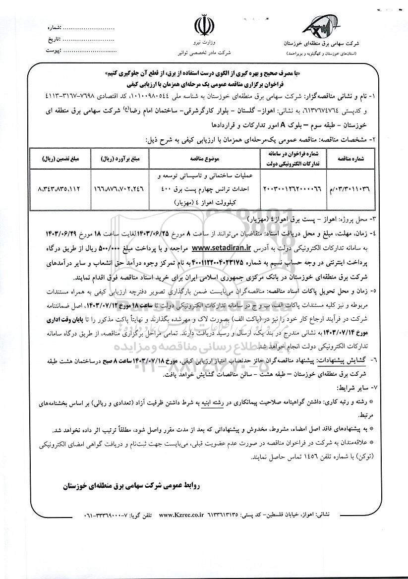3011036/ 03/ م | 2003001262000066 | عملیات ساختمانی وتاسیسات توسعه و احداث ترانس چهارم پست برق 400 کیلوولت اهواز 4 (مهزیار) | 166.876.702.246 | 8.343.835.112 |
