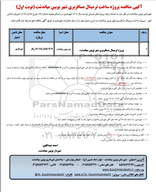 شهرداری بویین میاندشت در نظر دارد به استناد ردیف پروژه های عمرانی بودجه سال 1403 شهرداری در راستای مصوبه شماره 127 مورخ 1403.5.27 شورای اسلامی شهر، پروژه ساخت ترمینال مسافربری شهر بویین میاندشت به شرح جدول ذیل را از محل اعتبارات شهرداری از طریق آگهی مناقصه طبق شرایط ذیل اقدام نماید»