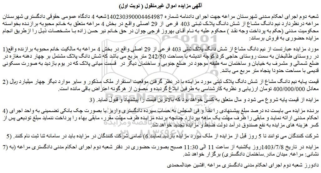 مزایده فروش نیم دانگ مشاع از شش دانگ پلاک ثبتی 403 فرعی از 29 اصلی, مزایده فروش نیم دانگ مشاع از شش دانگ پلاک ثبتی 403 فرعی از 29 اصلی