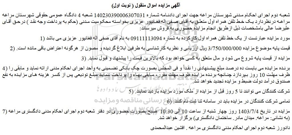 شعبه دوم اجرای احکام مدنی شهرستان مراغه جهت اجرای دادنامه شماره 140230390006307031 شعبه 4 دادگاه عمومی حقوقی شهرستان مراغه مراغه درنظردارد یک خط تلفن همراه اول متعلق به آقای صفی اله فغانپور عزیزی بخواسته محکومیت مدنی (حکم به پرداخت وجه نقد ) درحق آقای علیرضا عالی بامشخصات ذیل ازطریق انجام مزایده حضوری به فروش میرساند: