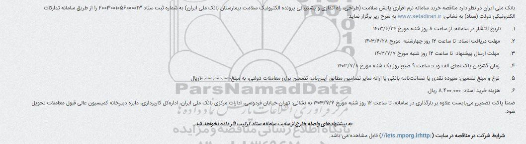 بانک ملی ایران در نظر دارد مناقصه خرید سامانه نرم افزاری پایش سلامت (طراحی، راه اندازی و پشتیبانی پرونده الکترونیک سلامت بیمارستان بانک ملی ایران) به شماره ثبت ستاد 2003001056000013 را از طریق سامانه تدارکات الکترونیکی دولت (ستاد) به نشانی: ستادایران به شرح زیر برگزار نماید:1.       تاریخ انتشار در سامانه: از ساعت 8 روز شنبه مورخ 1403.6.24