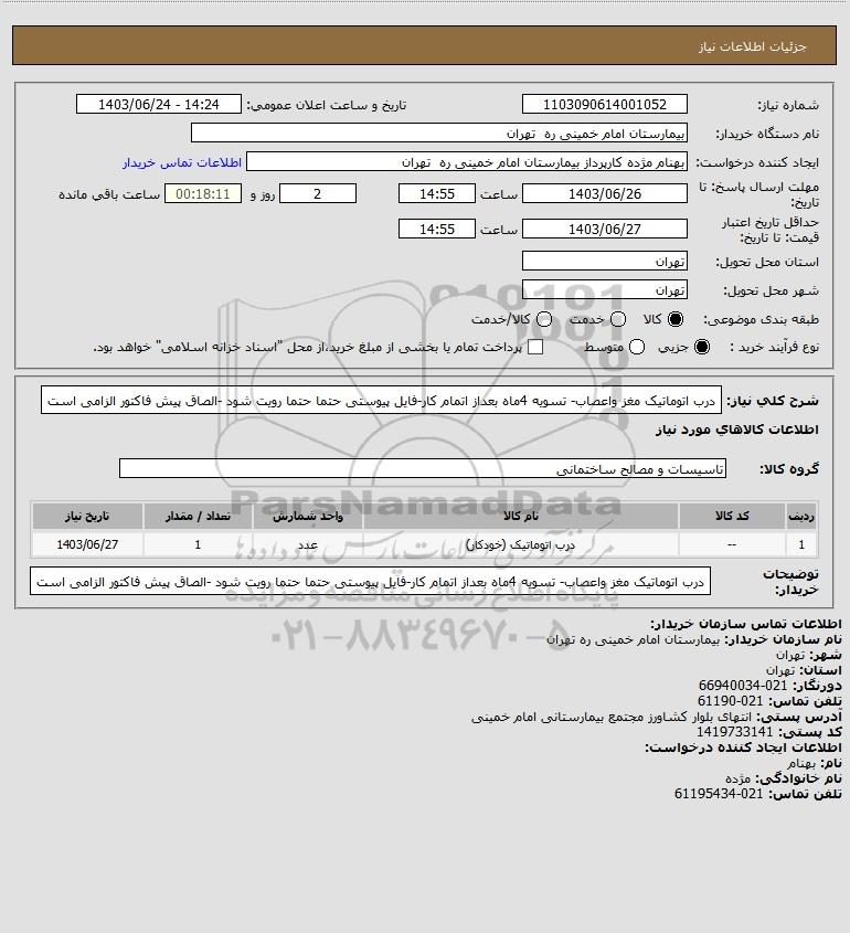 استعلام درب اتوماتیک مغز واعصاب- تسویه 4ماه بعداز اتمام کار-فایل پیوستی حتما حتما رویت شود -الصاق پیش فاکتور الزامی است, استعلام درب اتوماتیک مغز واعصاب- تسویه 4ماه بعداز اتمام کار-فایل پیوستی حتما حتما رویت شود -الصاق پیش فاکتور الزامی است