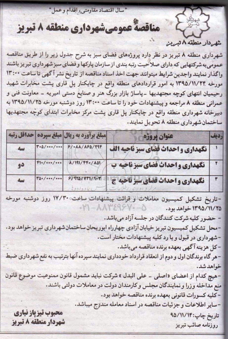 شهرداری منطقه 8 تبریز در نظر دارد پروژه های فضای سبز به شرح جدول زیر را از طریق مناقصه عمومی به شرکتهایی که دارای صلاحیت رتبه بندی از سازمان پارکها و فضای سبز شهرداری تبریز باشند واگذار نماید.