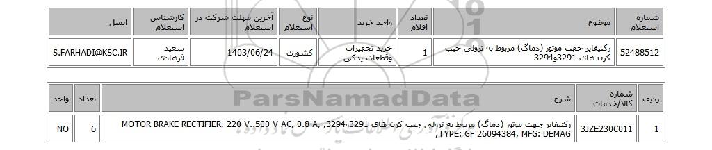 | 52488512 | رکتیفایر جهت موتور (دماگ) مربوط به ترولی جیب کرن های 3291و3294 | 1 | خرید تجهیزات وقطعات یدکی | کشوری | 1403/06/24 | سعید فرهادی | S.FARHADI@KSC.IR |