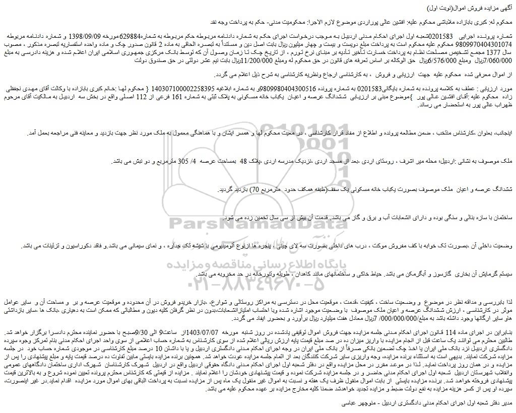 مورد ارزیابی : عطف به کلاسه پرونده به شماره بایگانی0201583 به شماره پرونده 9809980404300516و به شماره ابلاغیه 140307100002258395 { محکوم لها :خانم کبری بابازاده با وکالت آقای مهدی نجفقلی زاده محکوم علیه :آقای افشین عالی پور }موضوع مبنی بر ارزیابی ششدانگ عرصه و اعیان یکباب خانه مسکونی به پلاک ثبتی به شماره 161 فرعی از 112 اصلی واقع در بخش سه اردبیل به مالکیت آقای مرحوم ظهراب عالی پور به استحضار می رساند