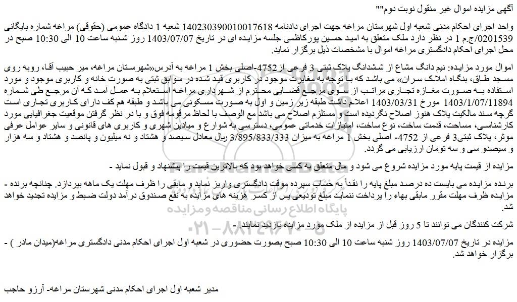 مزایده فروش نیم دانگ مشاع از ششدانگ پلاک ثبتی 3 فرعی از4752-اصلی, مزایده فروش نیم دانگ مشاع از ششدانگ پلاک ثبتی 3 فرعی از4752-اصلی