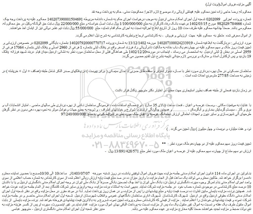 مورد ارزیابی : دربازگشت به ابلاغیه شماره 140207100024233919 مورخه 13/12/1402 به شماره پرونده 140207920000770717 بشماره بایگانی 0202099 در خصوص ارزیابی و تعیین قیمت روز ملک و سهم محکوم علیه دو چهاردهم یک باب خانه به مالکیت نادرآریائی راد فرزند اصغر واقع در پلاک ثبتی بشماره 1 فرعی از 2960 اصلی و پلاک ثبتی بشماره 17064 فرعی از 2959 اصلی در بخش 2 ثبتی اردبیـل به استحضار می رساند ، اینجانب در مورخه1402/12/20 طی هماهنگی قبلی از محل ساختمان مورد نظر به نشانی: اردبیل میدان قیام دربند شهید فرزانه پلاک 19 بازدید و پس ازکنترل اسناد و مدارک و بررسی لازم میدانی نتیجه بشرح ذیل تقدیم حضور می گردد: