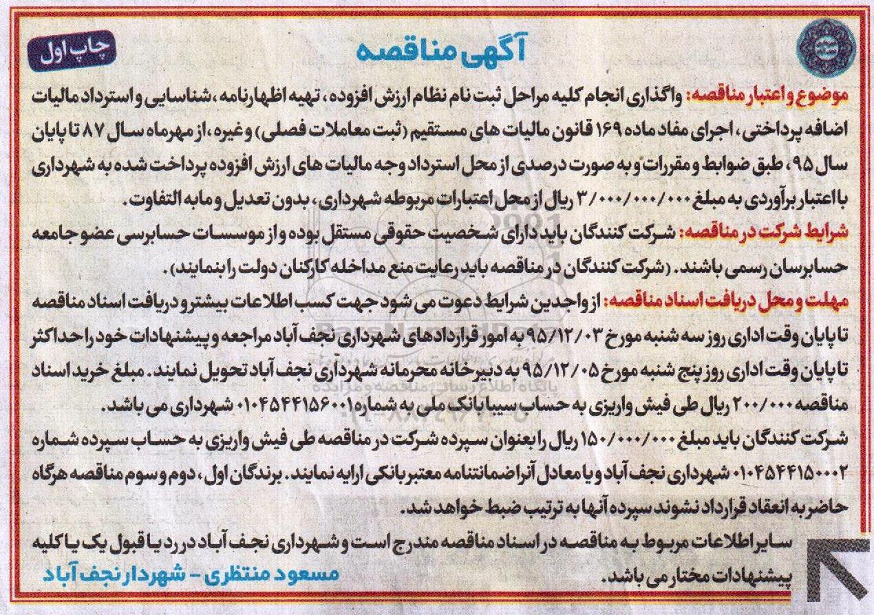موضوع و اعتبار مناقصه: واگذاری انجام کلیه مراحل ثبت نام نظام ارزش افزوده ، تهیه اظهارنامه ، شناسایی و استرداد مالیات اضافه پرداختی ، اجرای مفاد ماده 169 قانون مالیات های مستقیم ثبت معاملات فصلی و غیره از مهر ماه سال 87 تا پایان سال 95 طبق ضوابط و مقررات و به صورت درصدی از محل استرداد وجه مالیات های ارزش افزوده پرداخت شده به شهرداری با اعتبار براوردی به مبلغ 3.000.000.000 ریال از محل اعتبارات مربوطه شهرداری بدون تعدیل و مابه التفاوت