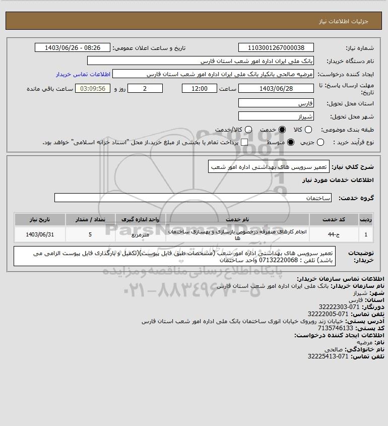 نام دستگاه خریدار:بانک ملی ایران اداره امور شعب استان فارس