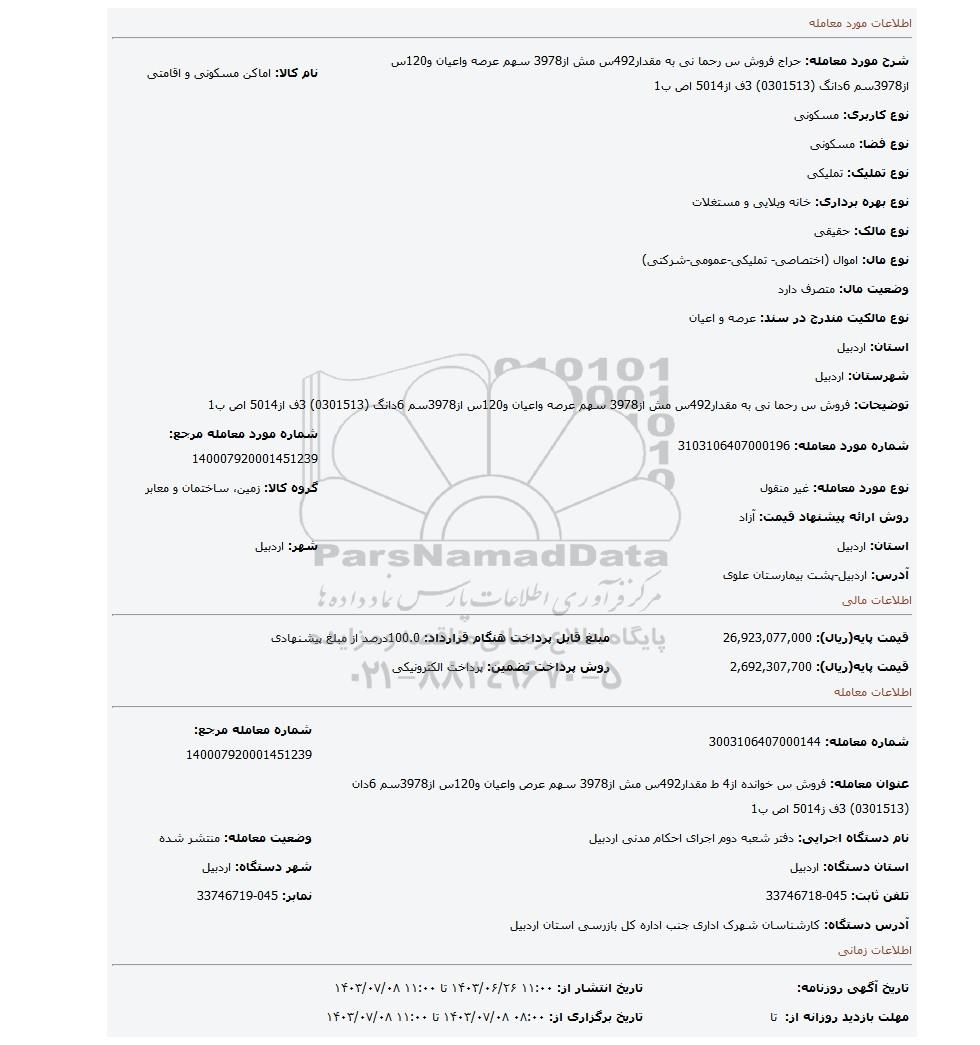 شرح مورد معامله: حراج فروش س رحما نی به مقدار492س مش از3978 سهم عرصه واعیان و120س از3978سم 6دانگ (0301513) 3ف از5014 اص ب1نام کالا: اماکن مسکونی و اقامتی