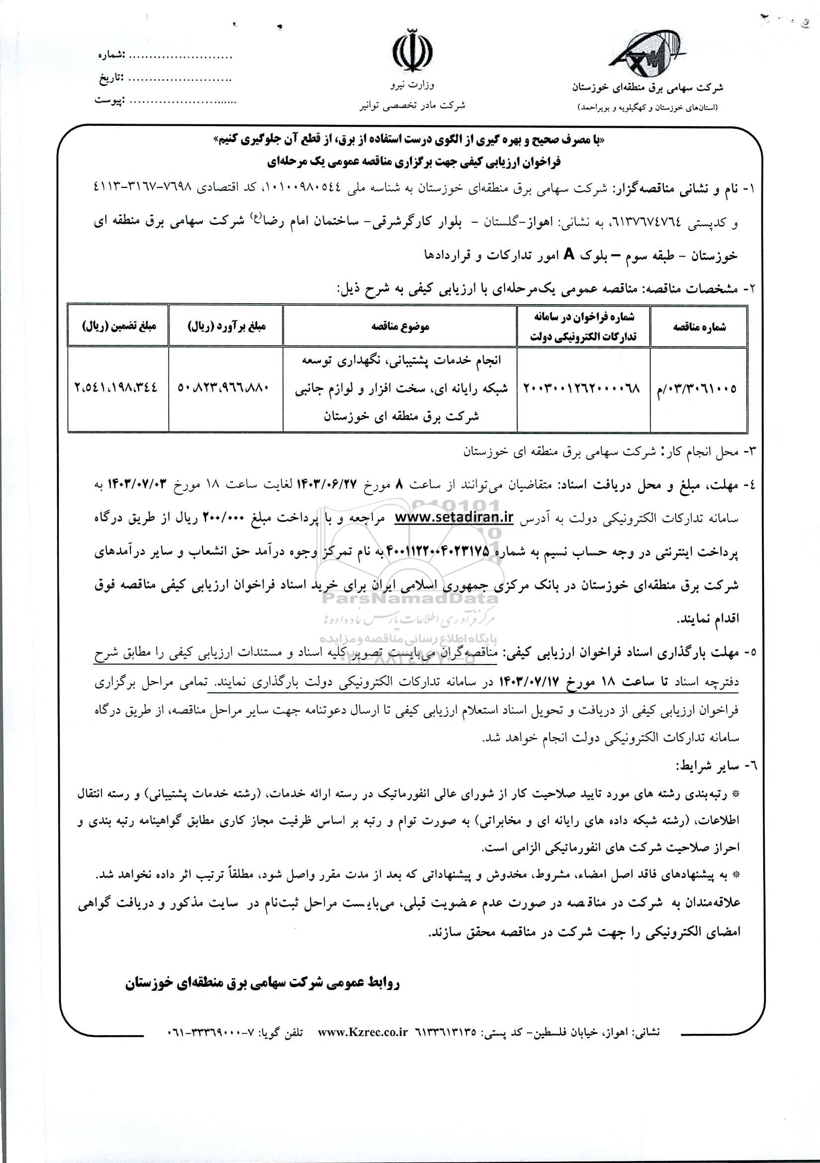 03/3061005/ م | 2003001262000068 | انجام خدمات پشتیبانی، نگهداری توسعه شبکه رایانه ای، سخت افزار و لوازم جانبی شرکت برق منطقه ای خوزستان | 50.823.966.880 | 2.541.198.344 |