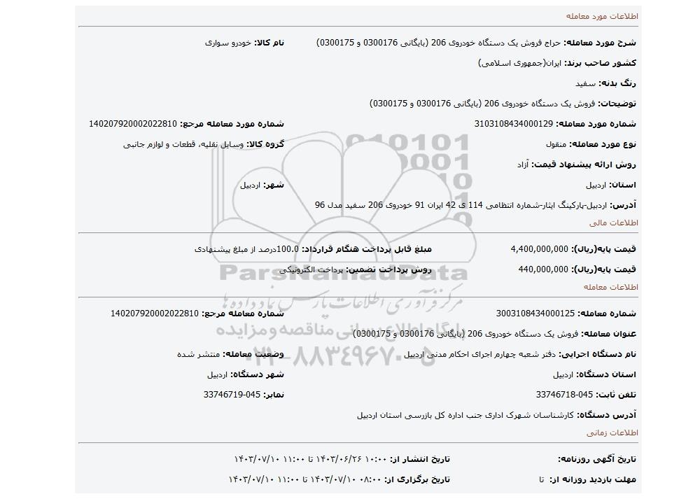 عنوان معامله: فروش یک دستگاه خودروی 206 (بایگانی 0300176 و 0300175) | ||