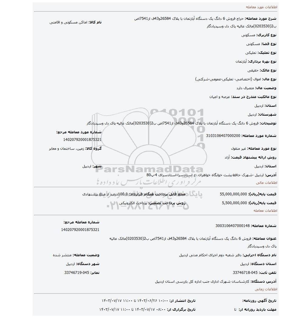 شرح مورد معامله: حراج فروش 6 دانگ یک دستگاه آپارتمان با پلاک 26584و43ف از7541اص ب2(0203530)مالک عالیه پاک دل وسیدیادگارنام کالا: اماکن مسکونی و اقامتی
