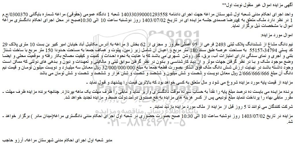 مزایده فروش نیم دانگ مشاع از ششدانگ پلاک ثبتی 2493 فرعی از 95 اصلی مفروز و مجزی از 62 , مزایده فروش نیم دانگ مشاع از ششدانگ پلاک ثبتی 2493 فرعی از 95 اصلی مفروز و مجزی از 62