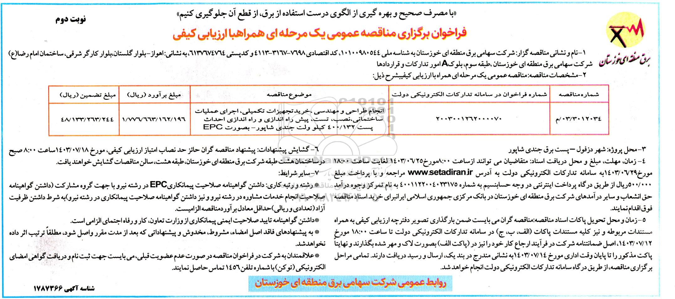 3012034 / 03 / م  2003001262000070   انجام طراحی و مهندسی، خرید تجهیزات تکمیلی، اجرای عملیات ساختمانی ،نصب، تست، پیش راه اندازی و راه اندازی احداث پست 400/132 کیلوولت جندی شاپور - بصورت EPC 1.776.663.162.196 48.133.263.244