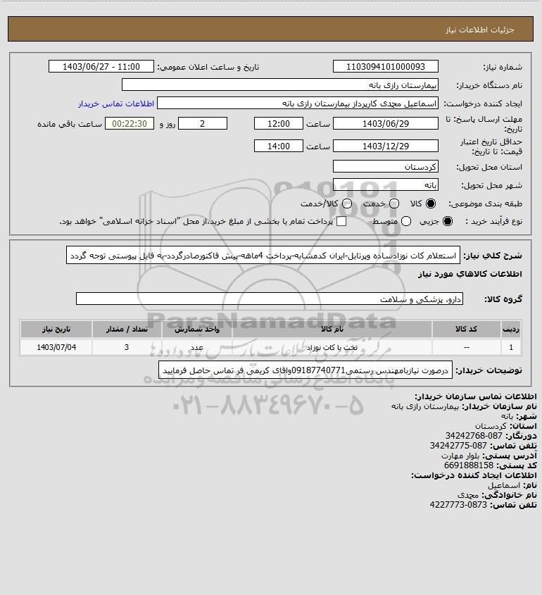 شرح کلی نیاز: استعلام کات نوزادساده وپرتابل-ایران کدمشابه-پرداخت 4ماهه-پیش فاکتورصادرگردد-به فایل پیوستی توجه گردد