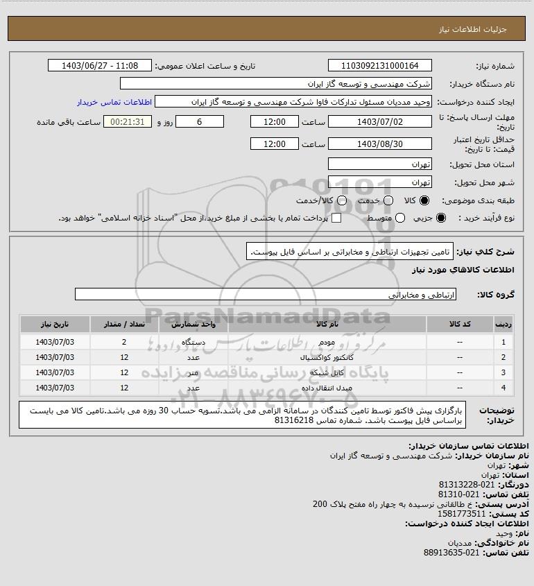 شرح کلی نیاز: تامین تجهیزات ارتباطی و مخابراتی بر اساس فایل پیوست.
