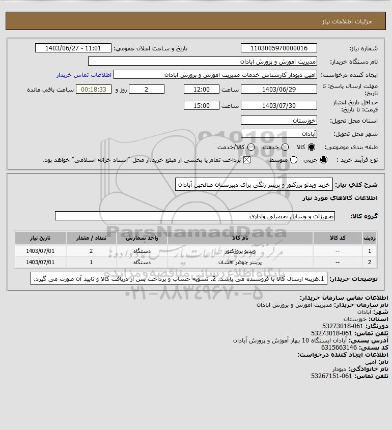 شرح کلی نیاز: خرید ویدئو پرژکتور و پرینتر رنگی برای دبیرستان صالحین آبادان