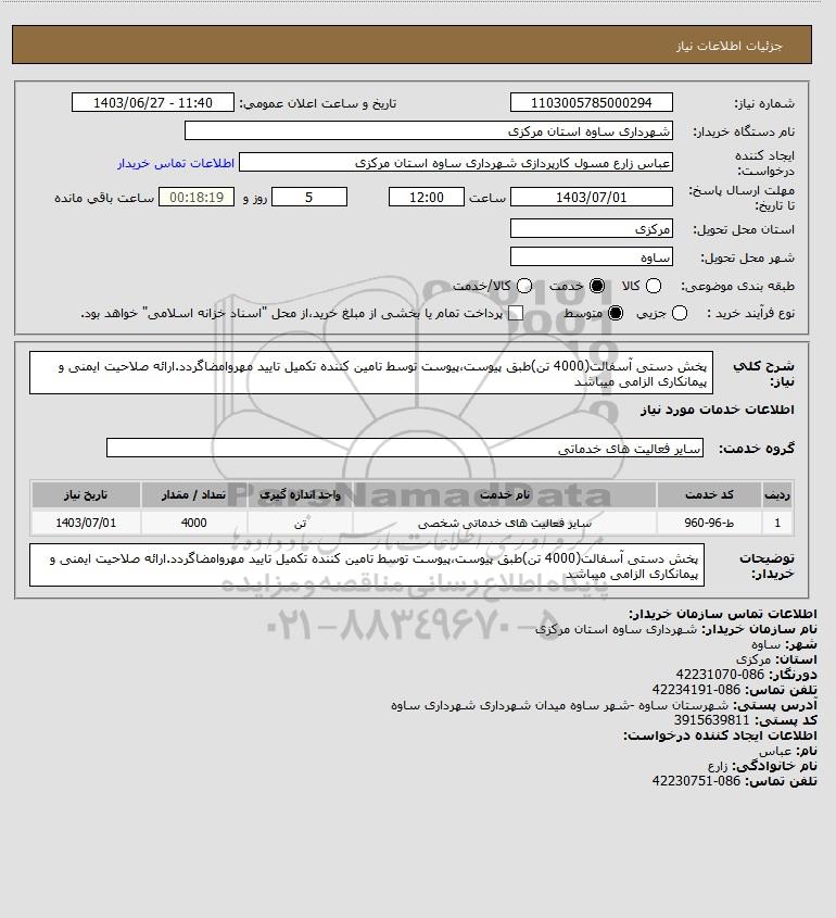 شرح کلی نیاز: پخش دستی آسفالت(4000 تن)طبق پیوست،پیوست توسط تامین کننده تکمیل تایید مهروامضاگردد.ارائه صلاحیت ایمنی و پیمانکاری الزامی میباشد