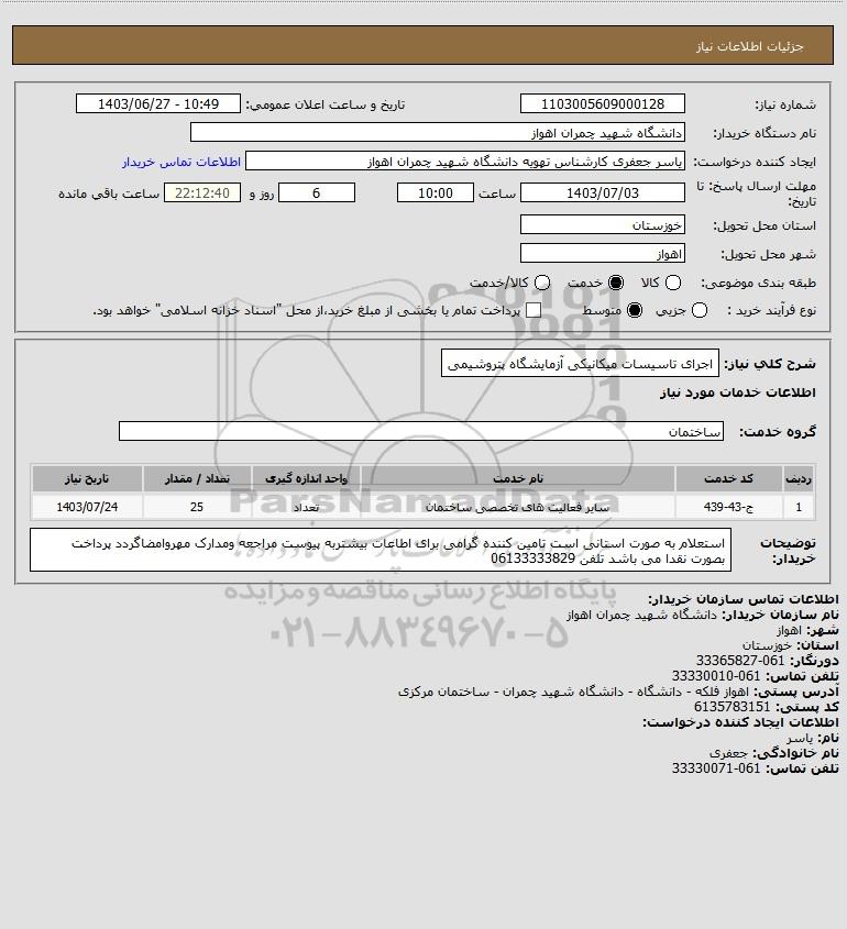 شرح کلی نیاز: اجرای تاسیسات میکانیکی آزمایشگاه پتروشیمی