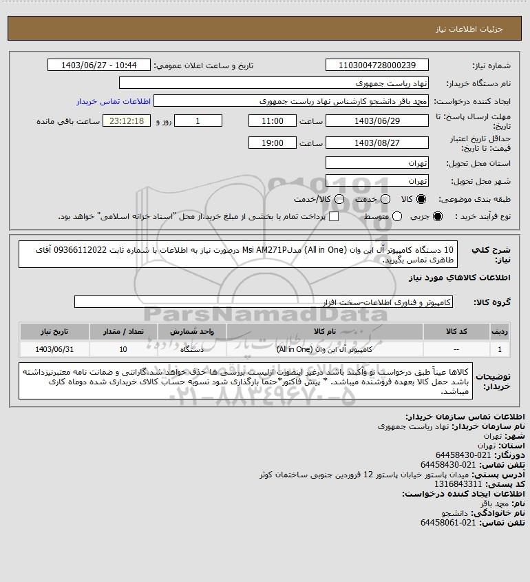 شرح کلی نیاز: 10 دستگاه کامپیوتر آل این وان (All in One) مدلMsi AM271P