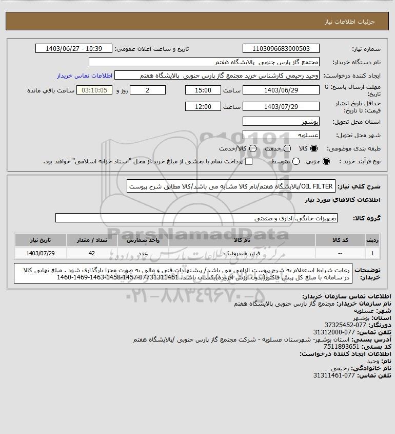 شرح کلی نیاز: OIL FILTER/پالایشگاه هفتم/نام کالا مشابه می باشد/کالا مطابق شرح پیوست