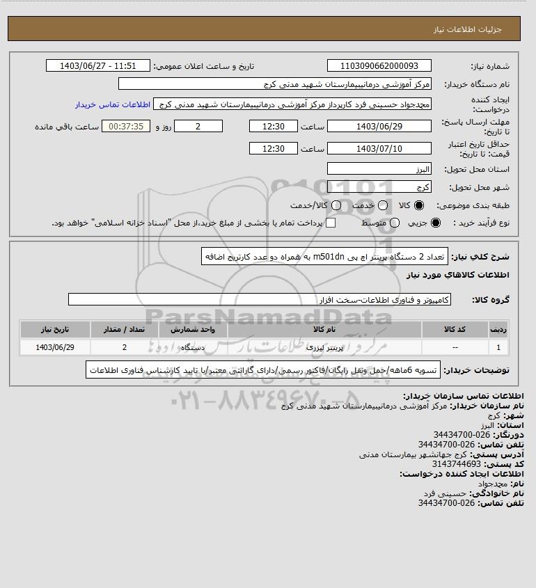شرح کلی نیاز: تعداد 2 دستگاه پرینتر اچ پی m501dn به همراه دو عدد کارتریج اضافه