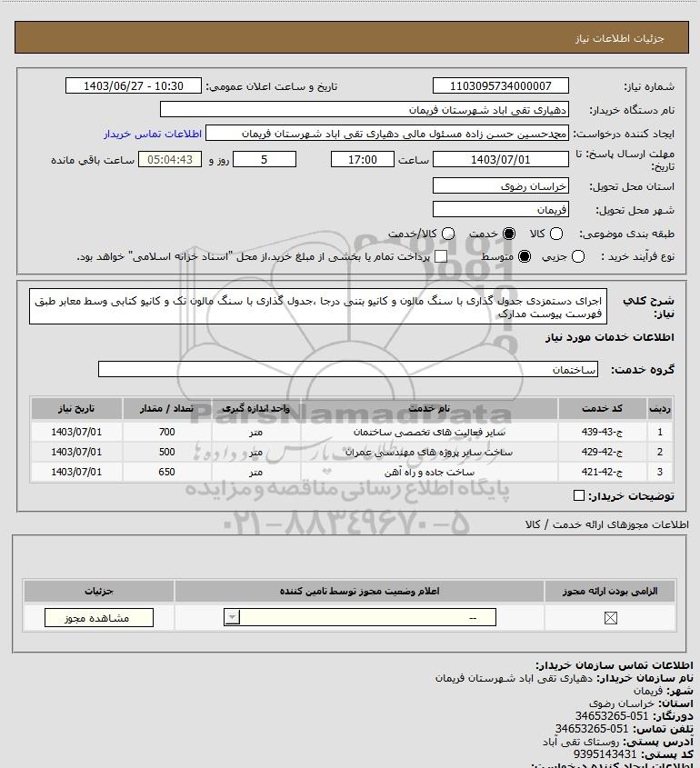 شرح کلی نیاز: اجرای دستمزدی جدول گذاری با سنگ مالون و کانیو بتنی درجا ،جدول گذاری با سنگ مالون تک و کانیو کتابی وسط معابر طبق فهرست پیوست مدارک