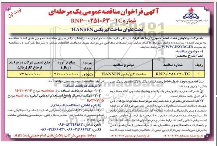 آگهی فراخوان مناقصه عمومی یک مرحله ای شماره RNP- 0251063-TC