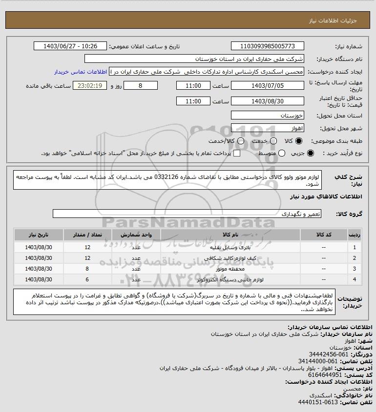 استعلام لوازم موتور ولوو کالای درخواستی مطابق با تقاضای شماره 0332126 می باشد.ایران کد مشابه است. لطفاً به پیوست مراجعه شود., استعلام لوازم موتور ولوو کالای درخواستی مطابق با تقاضای شماره 0332126 می باشد.ایران کد مشابه است. لطفاً به پیوست مراجعه شود.