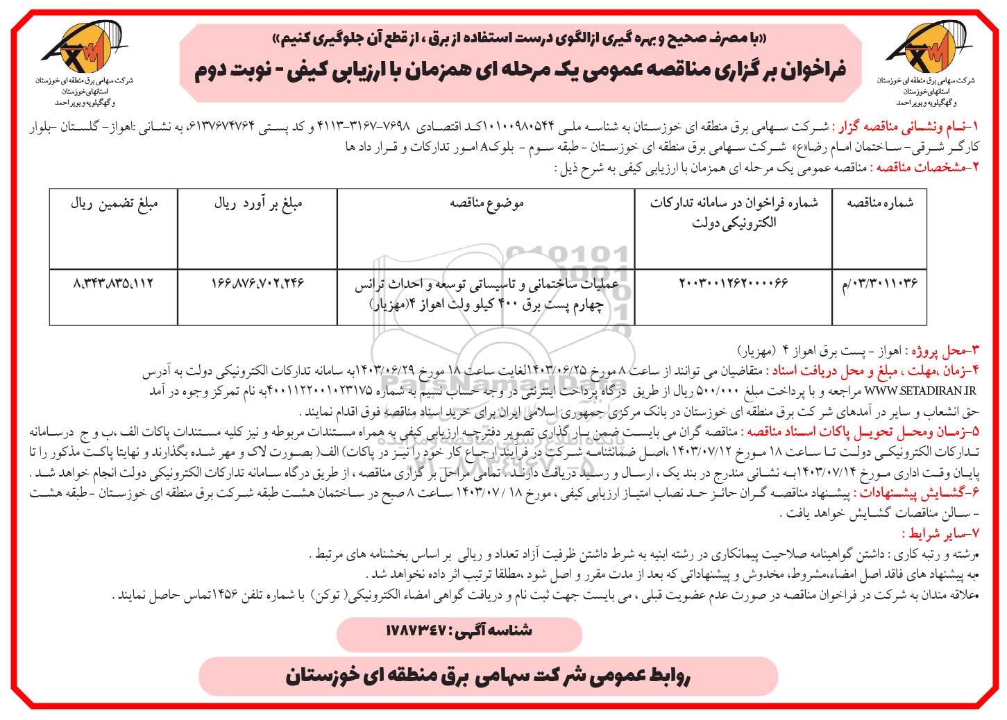 3011036/ 03/ م | 2003001262000066 | عملیات ساختمانی وتاسیسات توسعه و احداث ترانس چهارم پست برق 400 کیلوولت اهواز 4 (مهزیار) | 166.876.702.246 | 8.343.835.112 |