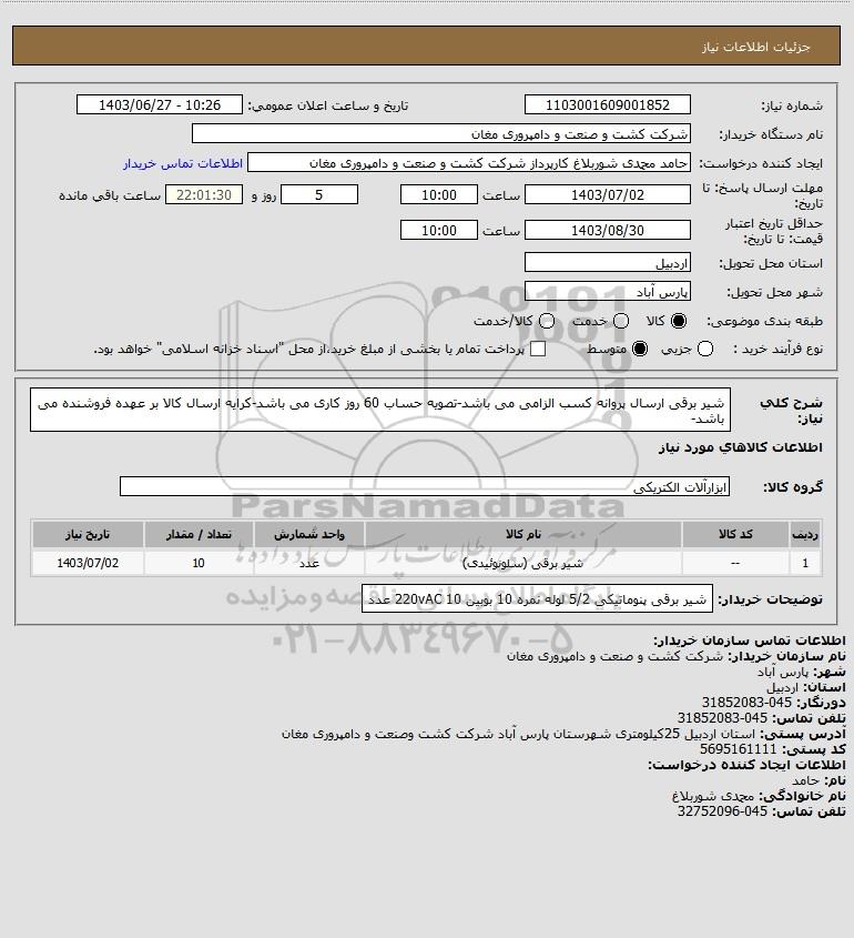 | 1 | -- | شیر برقی (سلونوئیدی) | عدد | 10 | 1403/07/02 |