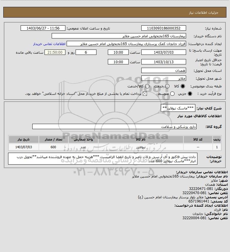نام دستگاه خریدار:بیمارستان 165تختخوابی امام حسین ملایر